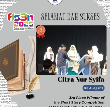 Citra Nur Syifa, seorang siswa dari kelas XII Al-Quds, baru-baru ini mencatatkan prestasi yang sangat membanggakan di kejuaraan Shorts Story Competition yang diadakan dalam rangka Festival Lomba Seni Siswa Nasional (FLS3N) di Kota Depok. Memenangkan juara 3, prestasi ini tidak hanya menunjukkan bakat menulisnya, tetapi juga kerja keras dan dedikasi yang telah dilakukannya selama ini.